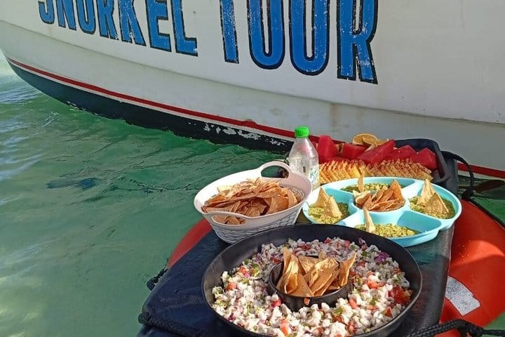 Immerse yourself in the underwater beauty of Cozumel with this shared snorkeling tour to Playa El Cielo. For approximately 4 hours, you will explore three stunning destinations: Palancar Reef, Columbia Reef and the famous Playa El Cielo, where you can swim among colorful fish and marvel at the marine life. The tour includes a delicious appetizer of fish ceviche, guacamole and fruit, as well as two beers or tequila for those over 18. With a maximum of 24 travelers per group, you will enjoy a more personalized and close experience with expert guides who share your passion for the sea.